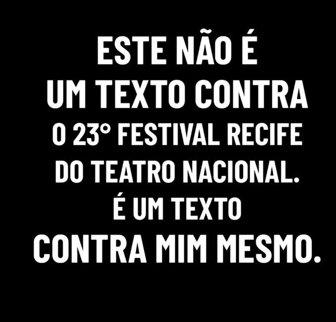 Em seu perfil, Marconi Bispo publicou: “Este não é um texto contra o 23º Festival Recife do Teatro Nacional. É um texto contra mim mesmo”. Confira todo o texto na íntegra: