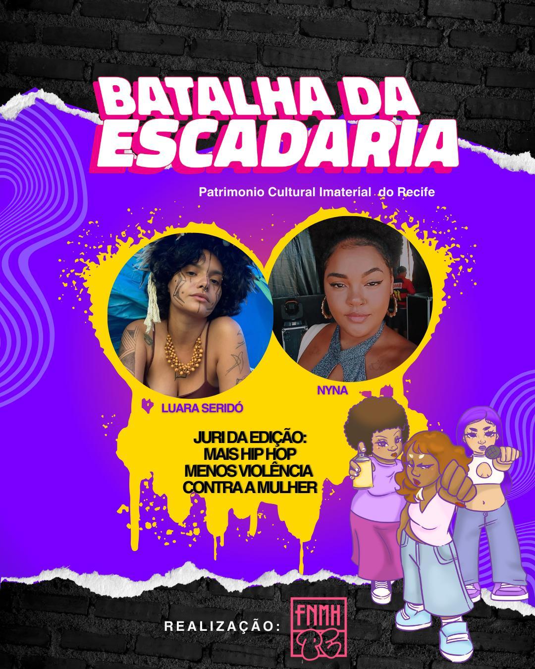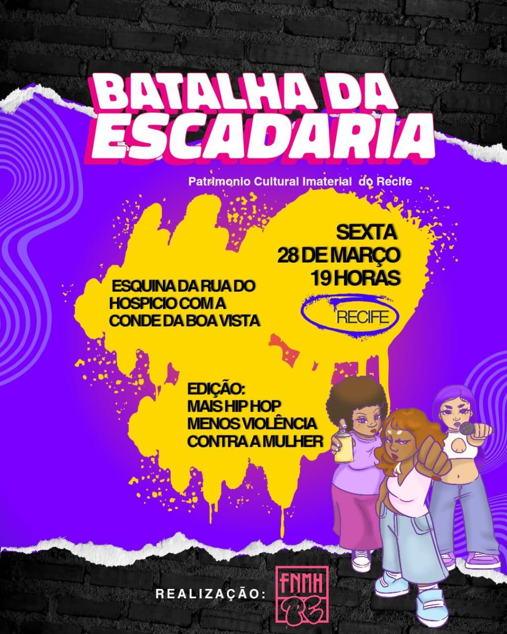 Em parceria com a Frente Nacional de Mulheres no Hip Hop (FNMH2) e a Frente Nacional de Mulheres no Hip Hop PE (FNMH2PE), a Batalha da Escadaria (PE) realiza a edição “Mais hip hop, menos violência contra a mulher”, nesta sexta-feira (28/03), a partir das 19h, tradicionalmente na esquina da rua do Hospício com a avenida Conde da Boa Vista, no centro do Recife. O encontro neste Mês da Mulher tem como objetivo o combate ao feminicídio e o fortalecimento das mulheres e suas identidades na arte de rua e cultura urbana.