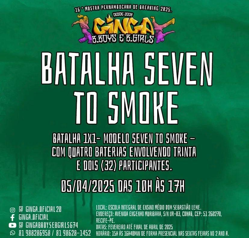 A Mostra Pernambucana de Breaking Ginga Bboys e Bgirls dá continuidade à programação com as batalhas de breaking, entrando em ação neste fim de semana (dias 05/04 - sábado e 06/04 - domingo), na quadra esportiva da Escola de Referência em Ensino Médio (Erem) Dom Sebastião Leme (Avenida Engenho Muribara, s/n), das 10h às 17h, na comunidade do Ibura (UR-03 Ibura de Cima/COHAB, Recife/PE).
